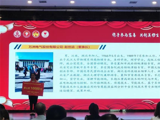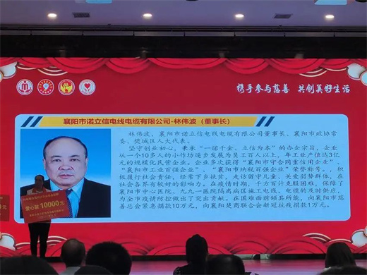活动中,开云集团官网首页捐赠10000元,襄阳市诺立信电线电缆有限公司捐赠10000元,襄阳世阳电机有限公司捐赠5000元。