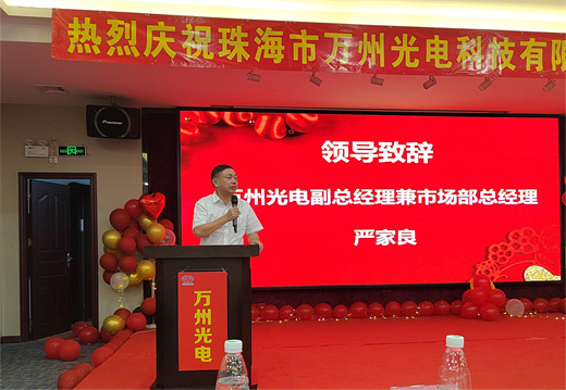 随后,珠海万州光电副总经理、市场部总经理严家良致辞。严总首先热烈欢迎集团公司领导班子和优秀干部、员工代表莅临万州光电二十周年厂庆活动,并表示万州光电全体员工将秉承万洲集团“造品牌产品、创品牌服务、做品牌企业”的经营理念,同心协力,奋勇前行,为早日实现万州光电两个重大目标贡献更多力量。