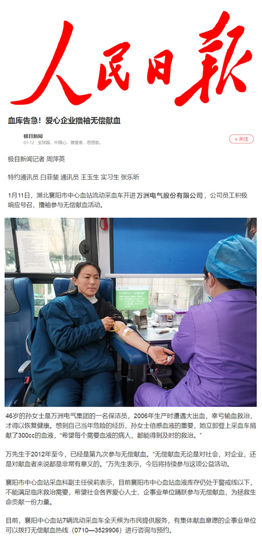 1月11日,湖北襄阳市中心血站流动采血车开进湖北万洲电气集团有限公司,公司员工积极响应号召,撸袖参与无偿献血活动。