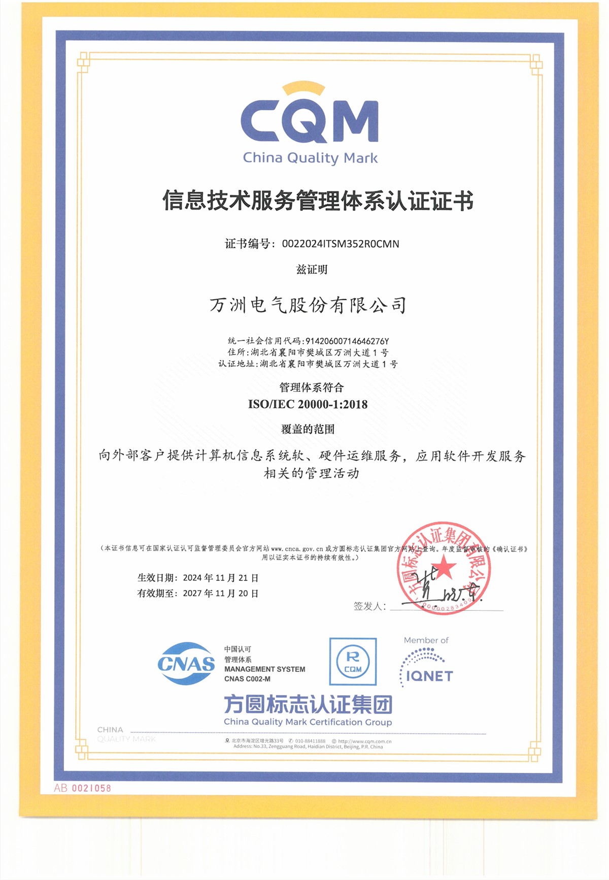 近日,万洲电气成功取得《信息技术服务管理体系》和《信息安全管理体系》两项认证证书。