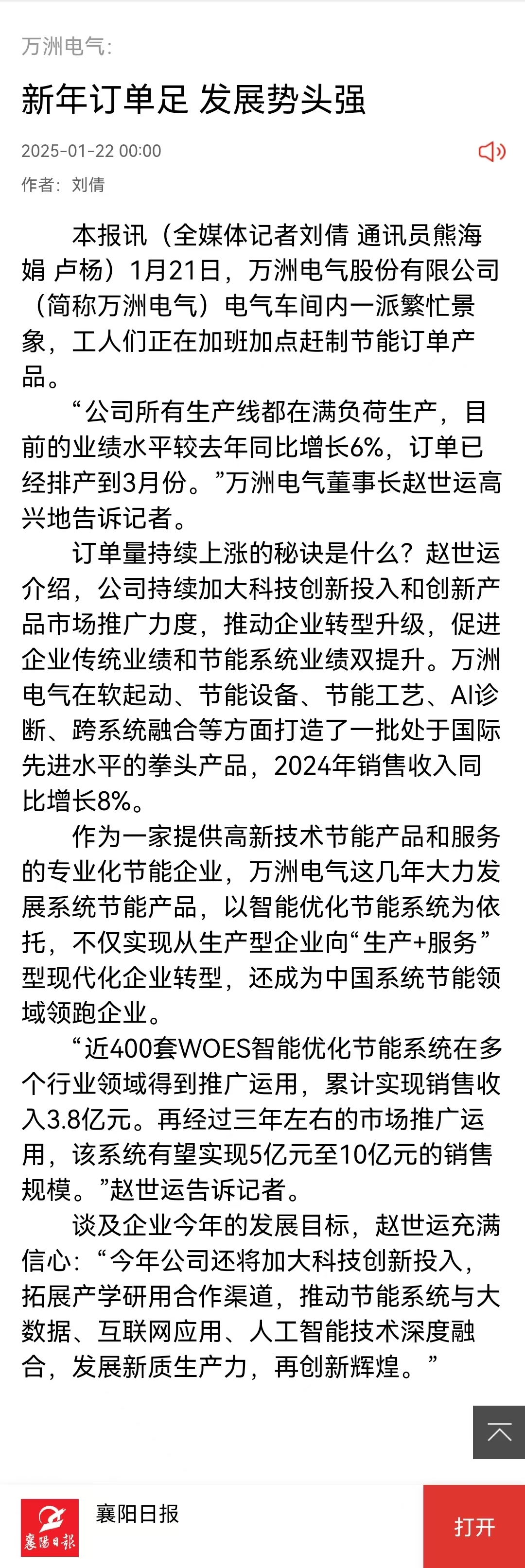 订单量持续上涨的秘诀是什么?赵世运介绍,公司持续加大科技创新投入和创新产品市场推广力度,推动企业转型升级,促进企业传统业绩和节能系统业绩双提升。万洲电气在软起动、节能设备、节能工艺、AI诊断、跨系统融合等方面打造了一批处于国际先进水平的拳头产品,2024年销售收入同比增长8%。