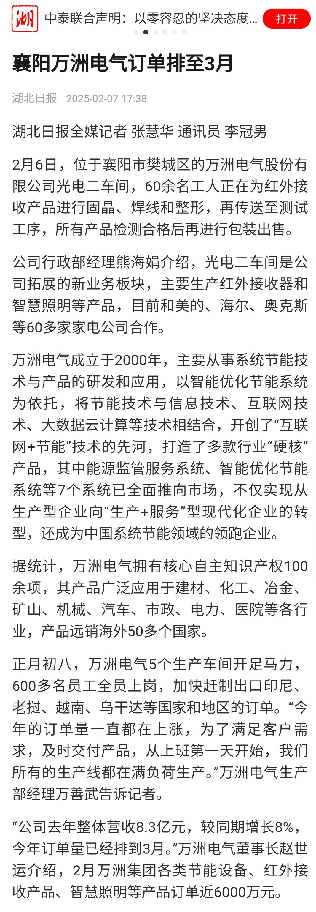 “公司去年整体营收8.3亿元,较同期增长8%,今年订单量已经排到3月。”万洲电气董事长赵世运介绍,2月万洲集团各类节能设备、红外接收产品、智慧照明等产品订单近6000万元。