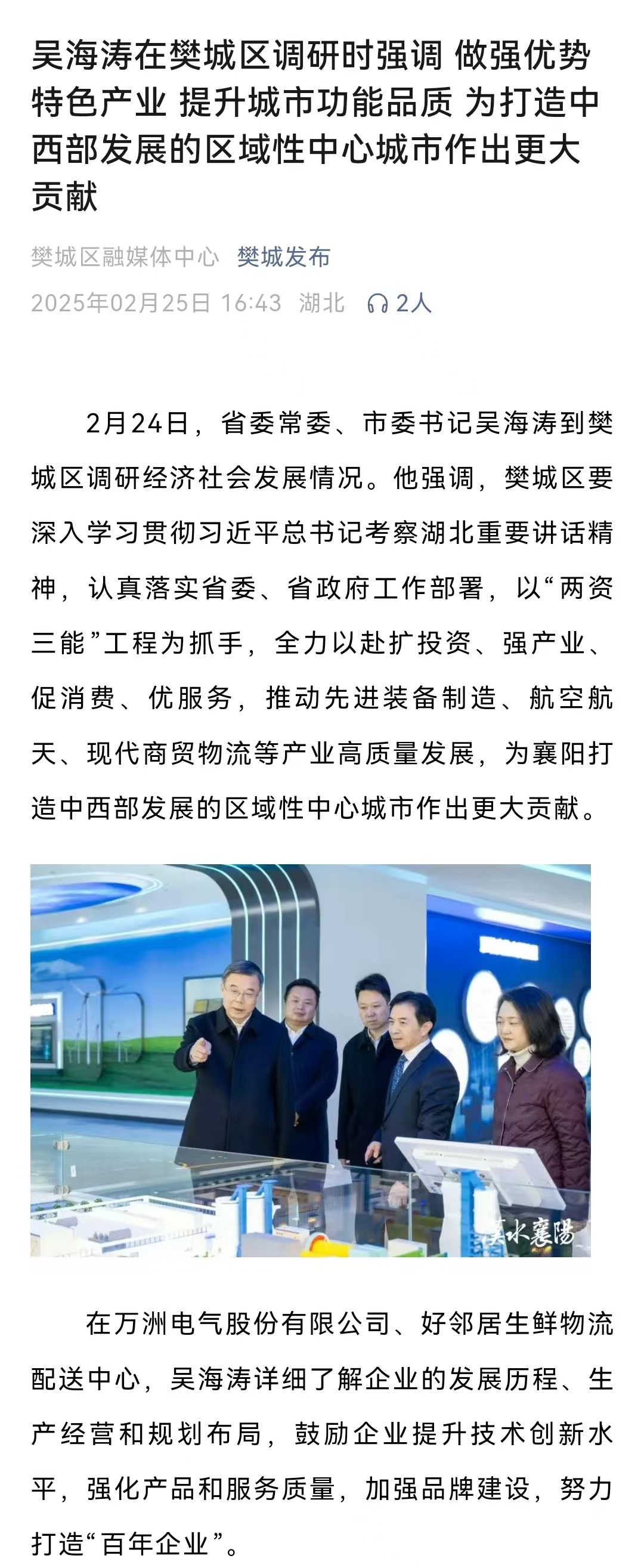 2月24日,省委常委、市委书记吴海涛到樊城区调研经济社会发展情况。他强调,樊城区要深入学习贯彻习近平总书记考察湖北重要讲话精神,认真落实省委、省政府工作部署,以“两资三能”工程为抓手,全力以赴扩投资、强产业、促消费、优服务,推动先进装备制造、航空航天、现代商贸物流等产业高质量发展,为襄阳打造中西部发展的区域性中心城市作出更大贡献。