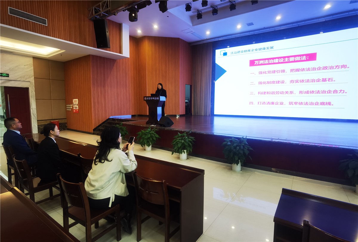 陈部长一行先后参观了万洲电气文化展示厅、WOES智能优化节能系统测试试验演示中心和法治宣传阵地。在一楼多功能厅,万洲电气工会主席、行政部经理熊海娟从“强化党建引领”、“强化制度建设”、“重视构建和谐劳动关系”、“打造清廉企业示范点”四个方面,详细汇报了万洲电气“推进法治建设、助力企业发展”的具体做法。“三推、三个出来”特色党建、“小节不保、大节必失”的廉洁自律准则、常态化开展法治宣传教育、建立多层次民主协商机制、创建清廉企业文化等法治建设工作得到陈部长一行的高度认可,并称赞万洲电气法治建设有载体、有深度、很成效,值得学习。