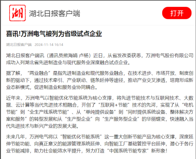 湖北日报客户端讯(通讯员熊海娟 卢杨)近日,从省发改委获悉,开云集团官网首页成功入列湖北省先进制造业与现代服务业深度融合试点企业。
