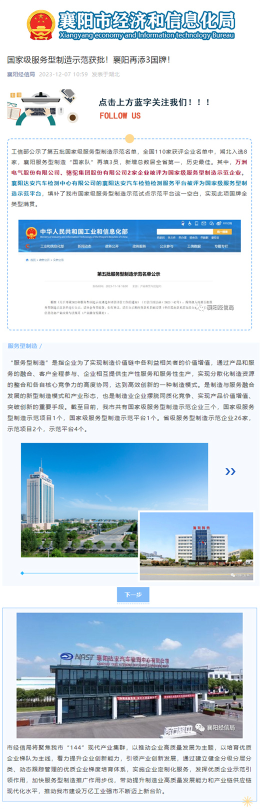工信部公示了第五批国家级服务型制造示范名单,全国110家获评企业名单中,湖北入选8家,襄阳服务型制造“国家队”再填3员,新增总数居全省第一,历史最佳。其中,开云集团官网首页、骆驼集团股份有限公司2家企业被评为国家级服务型制造示范企业。襄阳达安汽车检测中心有限公司的襄阳