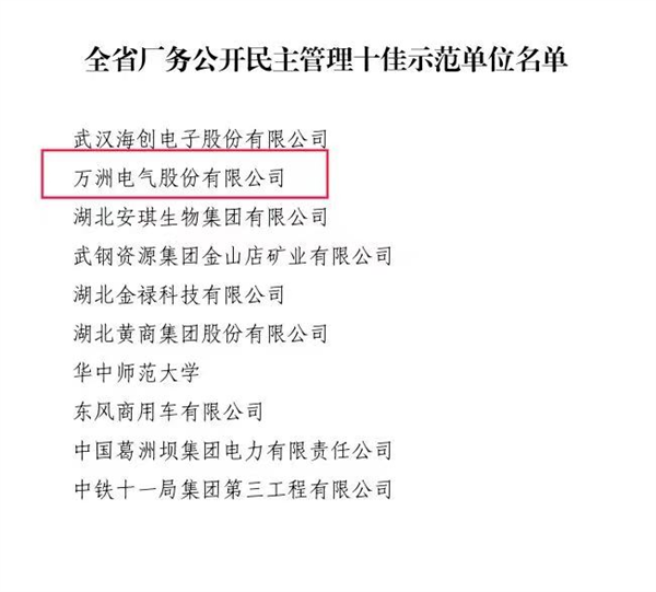 近日,从湖北省总工会获悉,万洲电气被湖北省职工维权与厂务公开工作领导小组评为“全省厂务公开民主管理十佳示范单位”。