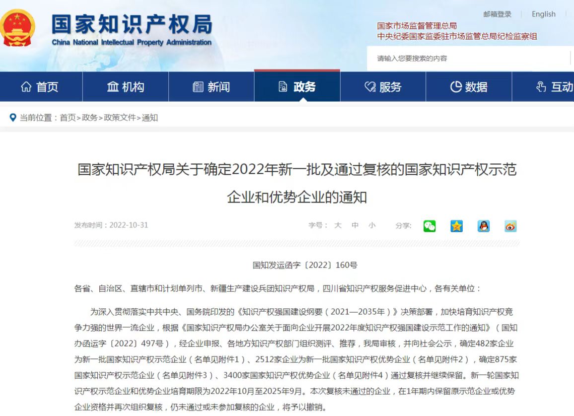 11月2日,从国家知识产权局传来喜讯,开云集团官网首页上榜2022年新确定的国家知识产权优势企业名单。