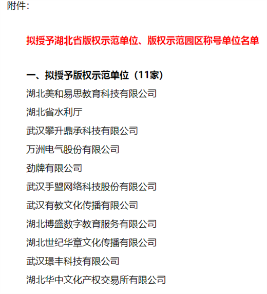日前,从湖北省版权局获悉,万洲电气被授予湖北省版权示范单位!