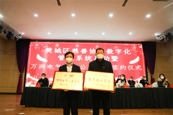 12月30日下午,在樊城区慈善协会举办的“ 樊城区慈善协会数字化管理系统启动暨万洲电气慈善公益基金签约”仪式上,万洲电气为樊城区慈善协会捐款13万元成立“万洲电气公益基金”并获“慈善爱心单位”荣誉称号。万洲电气董事长、总经理赵世运参加签约仪式。