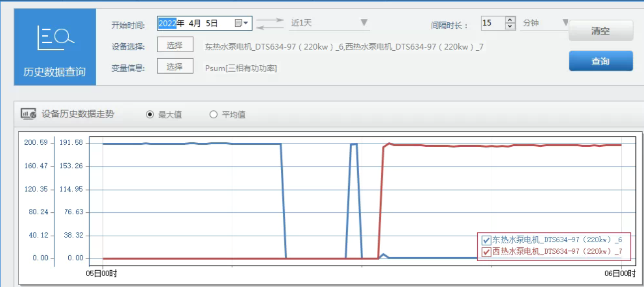 2、热水泵运行状态优化节能。现场两台热水泵,额定功率均为220kW,采用一用一备方式运行。用户通过系统实时数据功能发现:综合泵房东热水泵和西热水泵运行存在差异,东热水泵运行负荷稳定在190kW,西热水泵运行负荷稳定在200kW。发现问题后对西热水泵进行了检修,检修完毕后西热水泵功率降低了10kW,每年可以节约电费2.9万元。